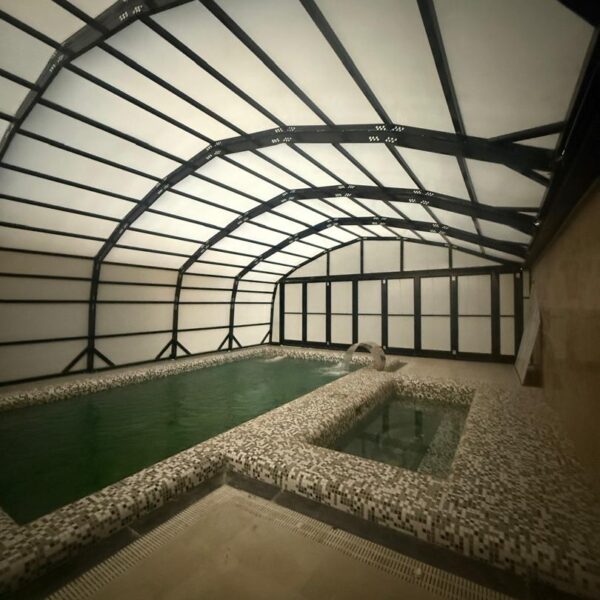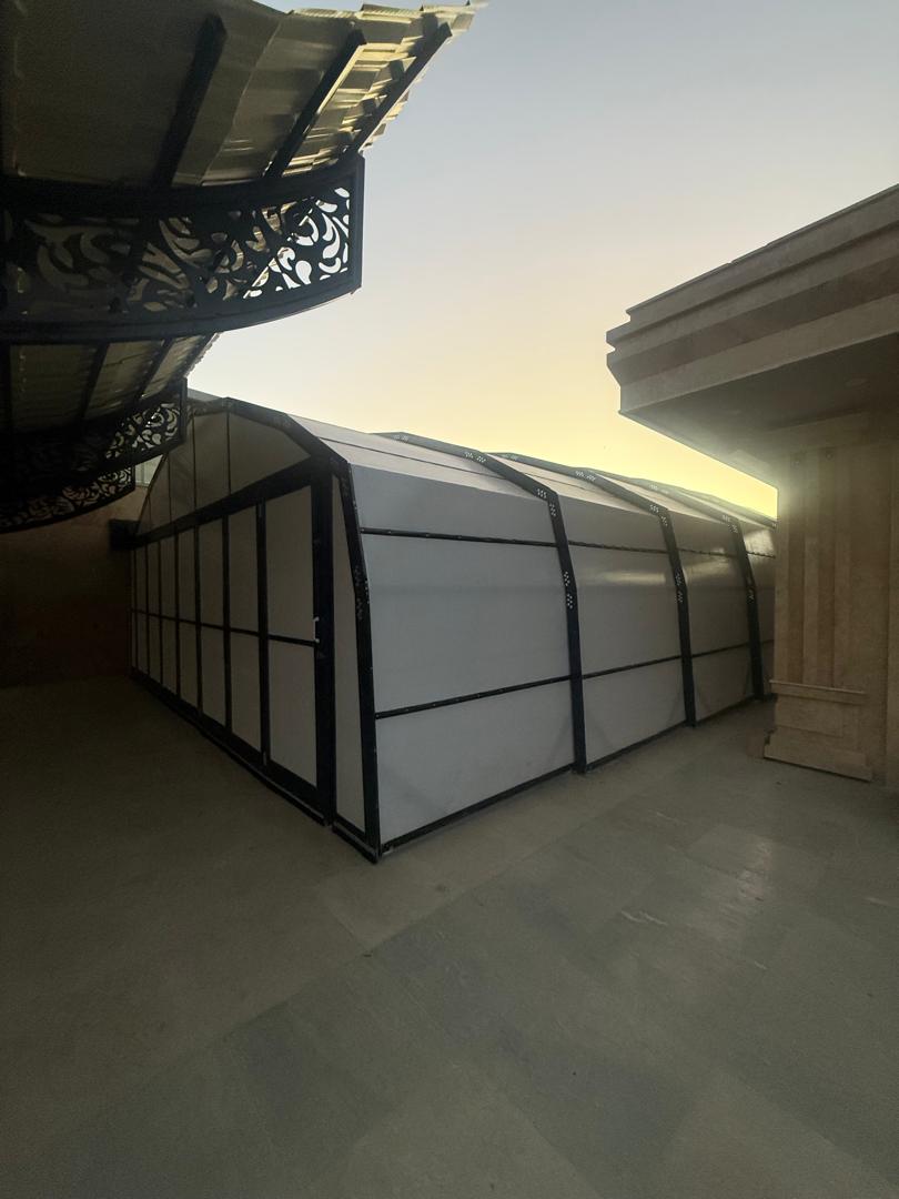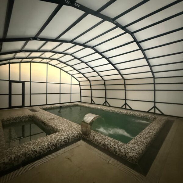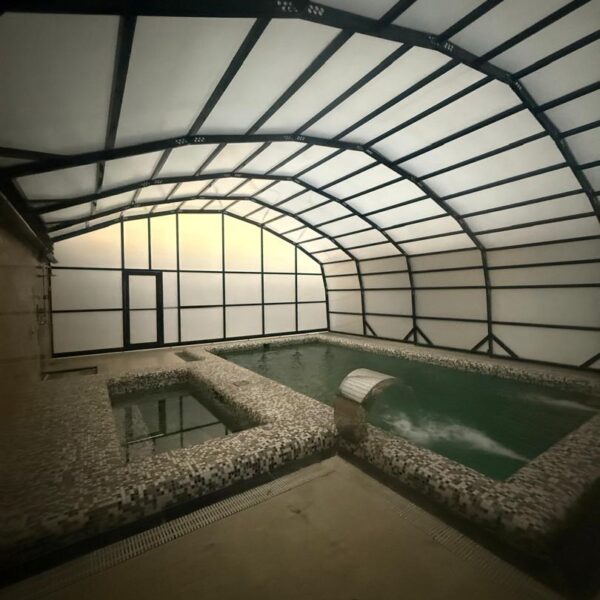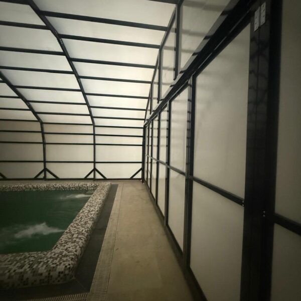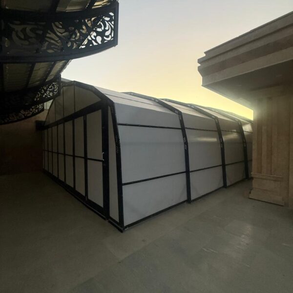 پروژه سقف متحرک استخر با سازه آلومینیومی و ورق پلی کربنات سفید توسط شرکت آلکاروف طراحی، تولید و نصب شده است.